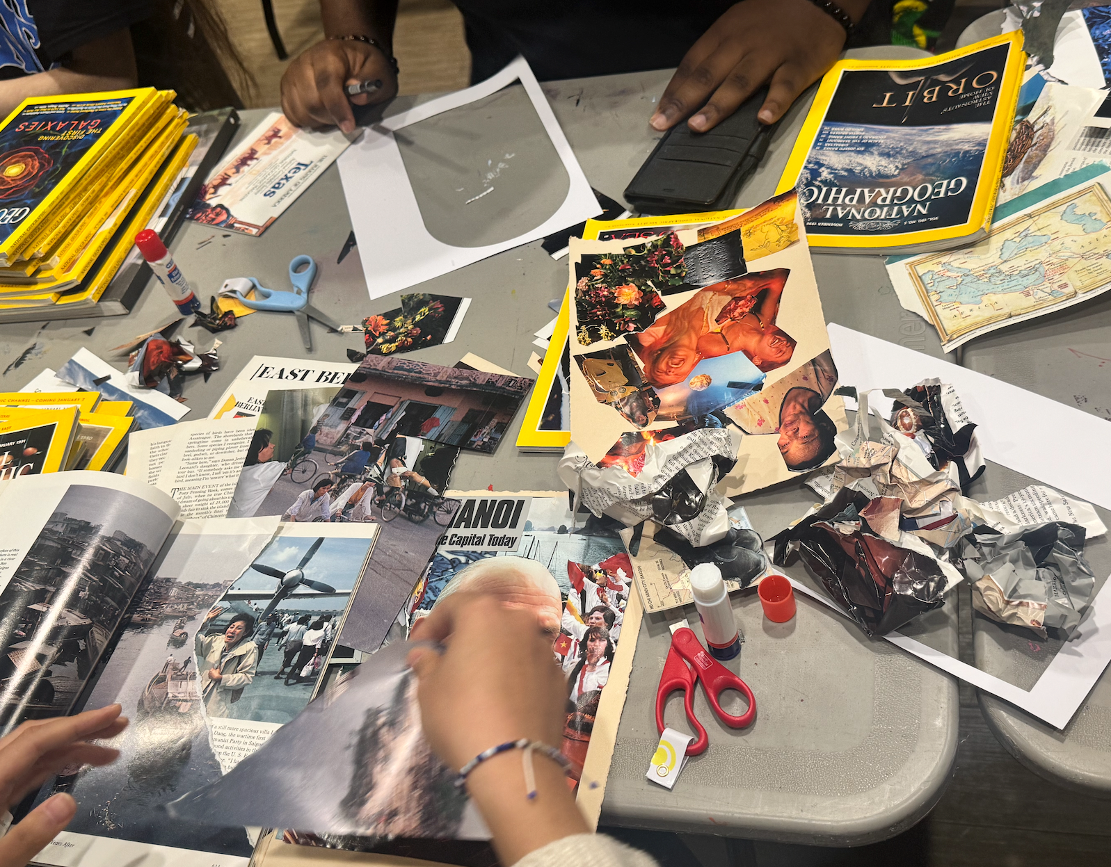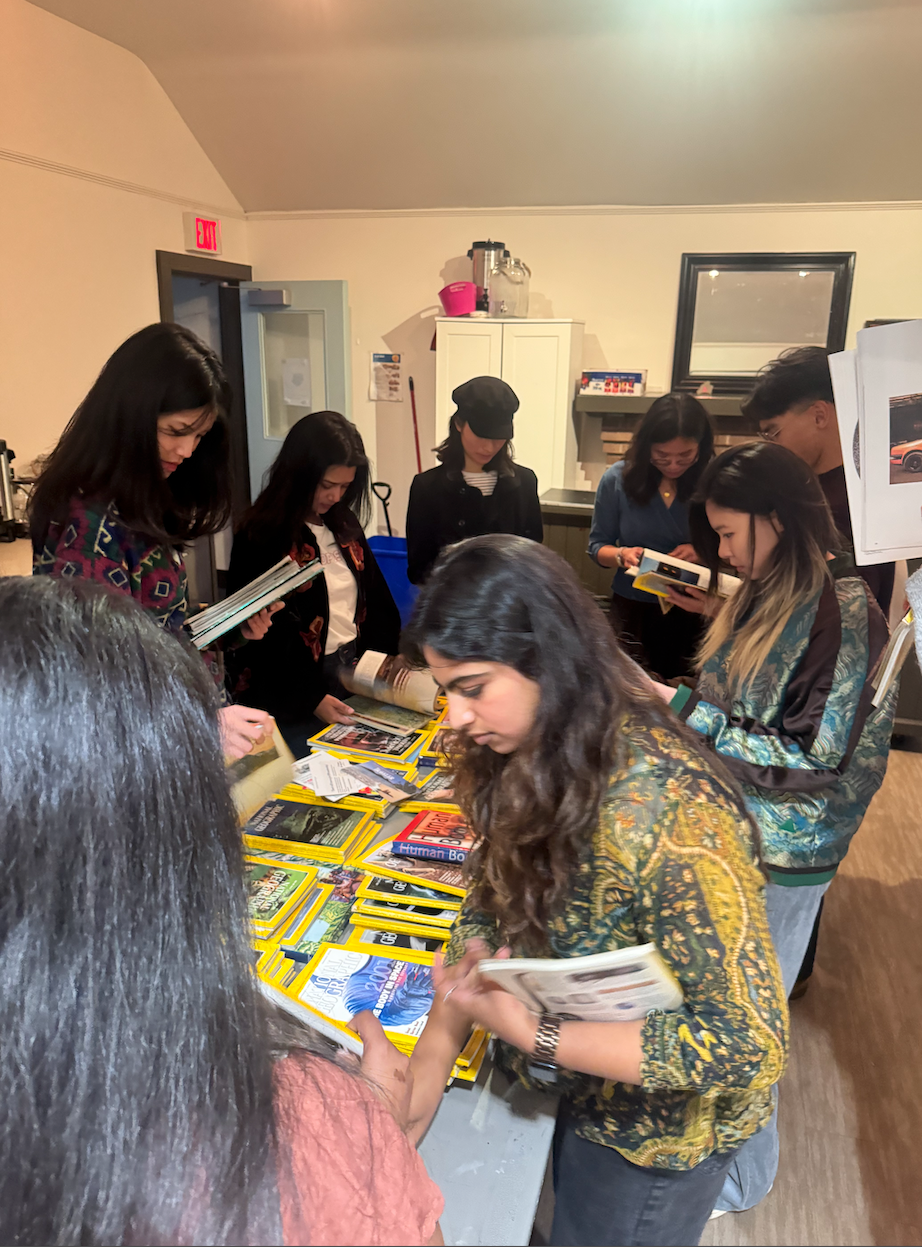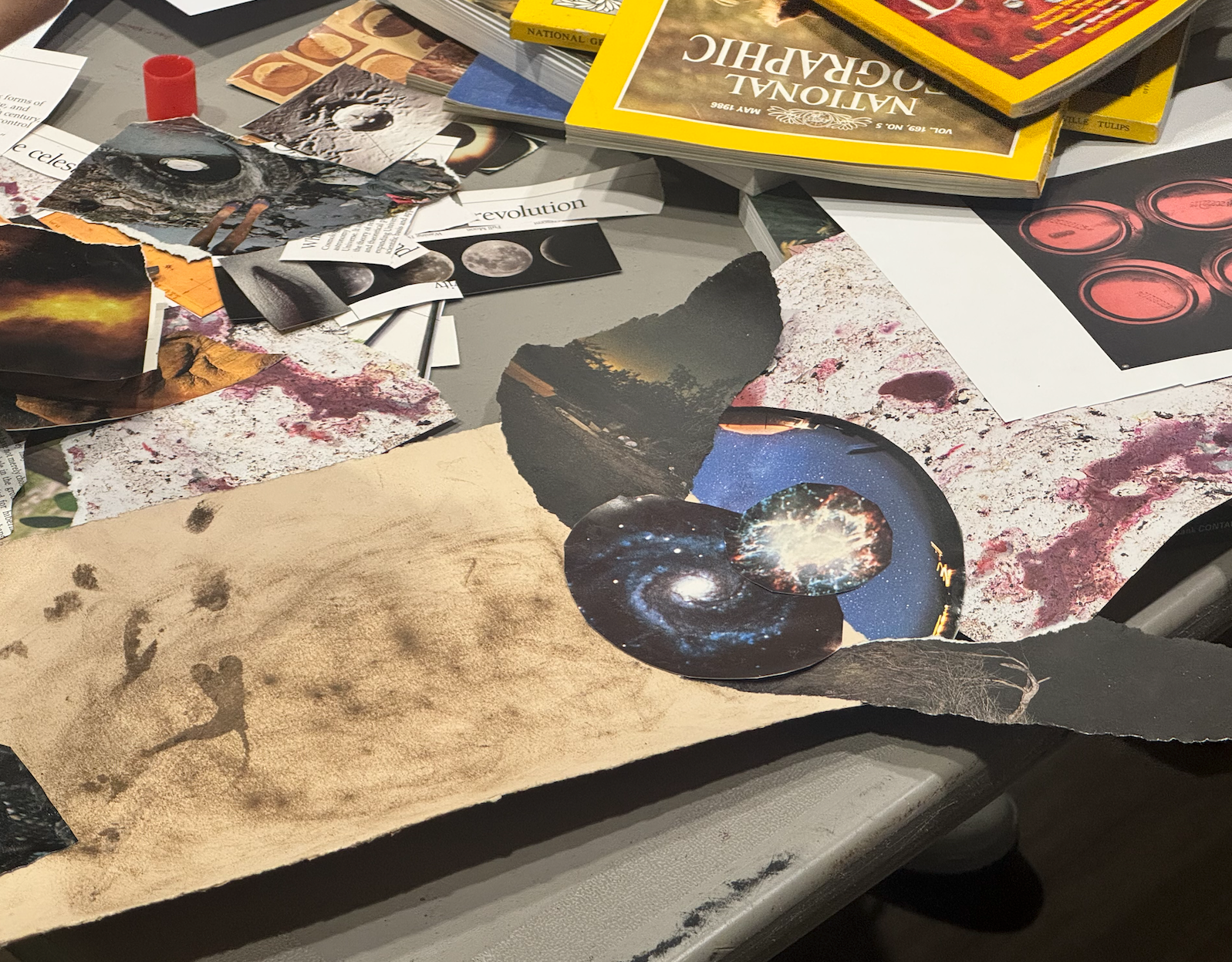 You won’t need anything too complicated to build your God. Find yourself some scissors and glue alongside a collection of old magazines, picture books and paper that you wouldn’t mind cutting up and rearranging. On the day of the original Build-A-God workshop, students shuffled into the clubhouse where they were provided safety scissors, glue and over 250 pristine, vintage National geographic magazines to rifle through and cut up.