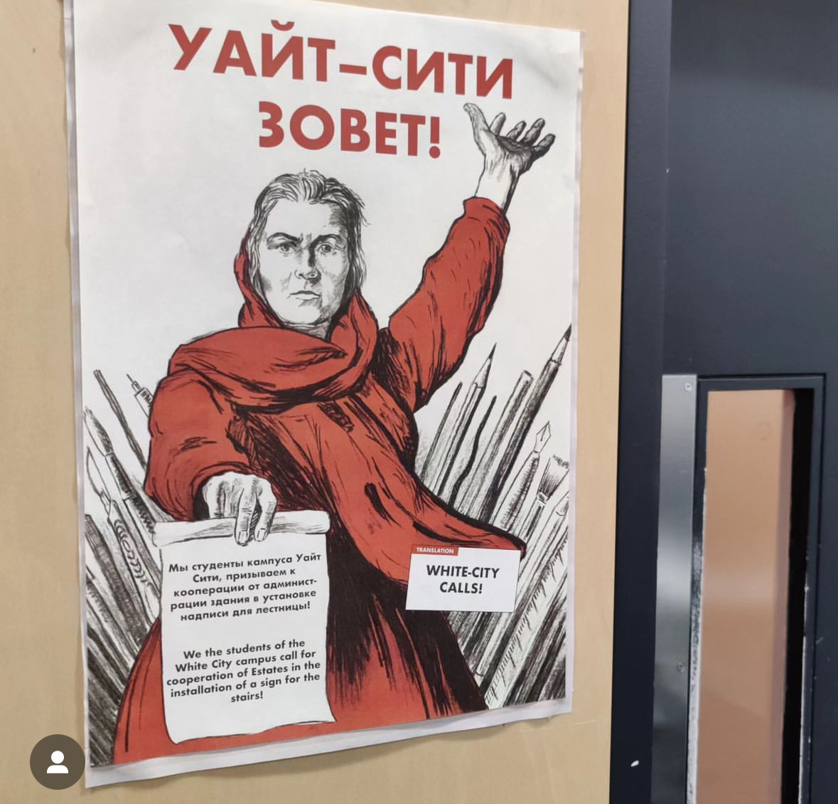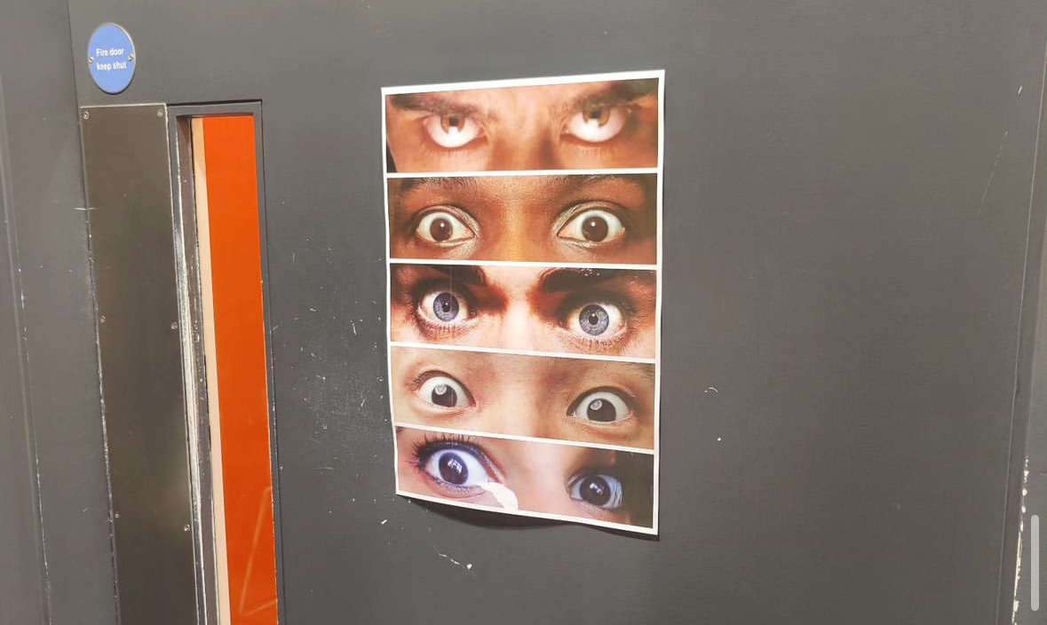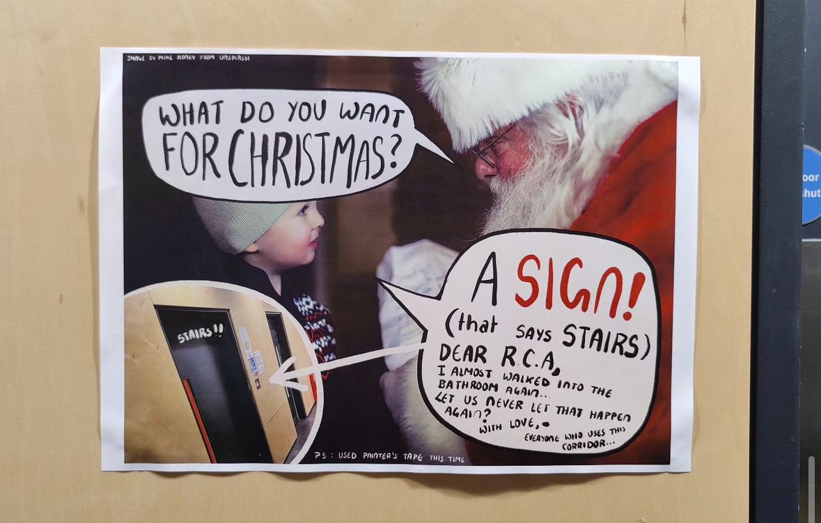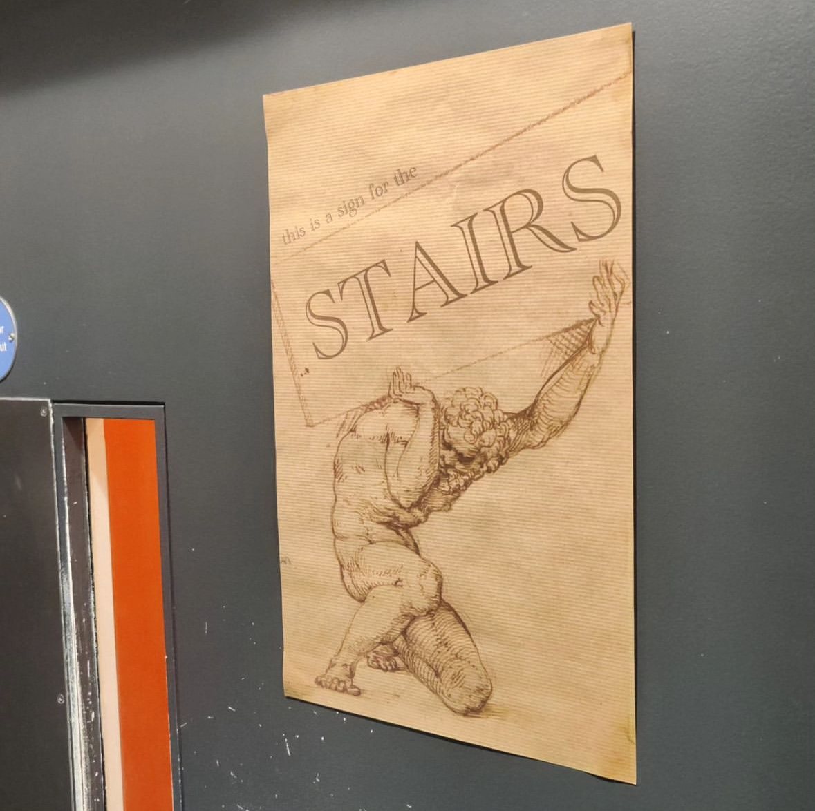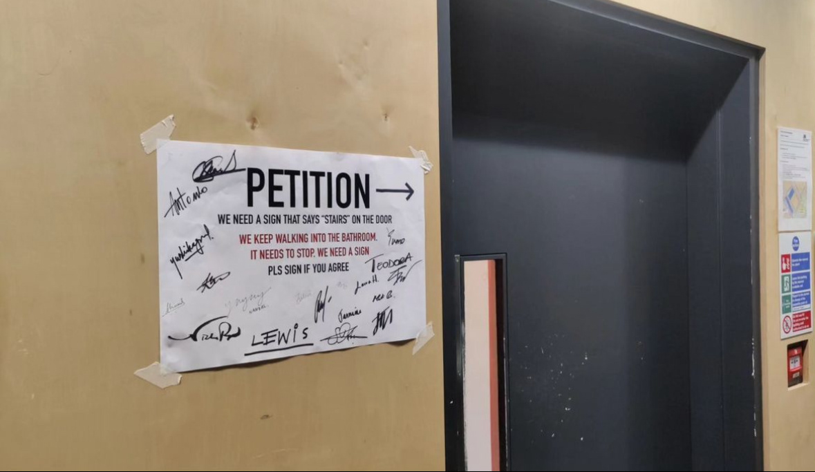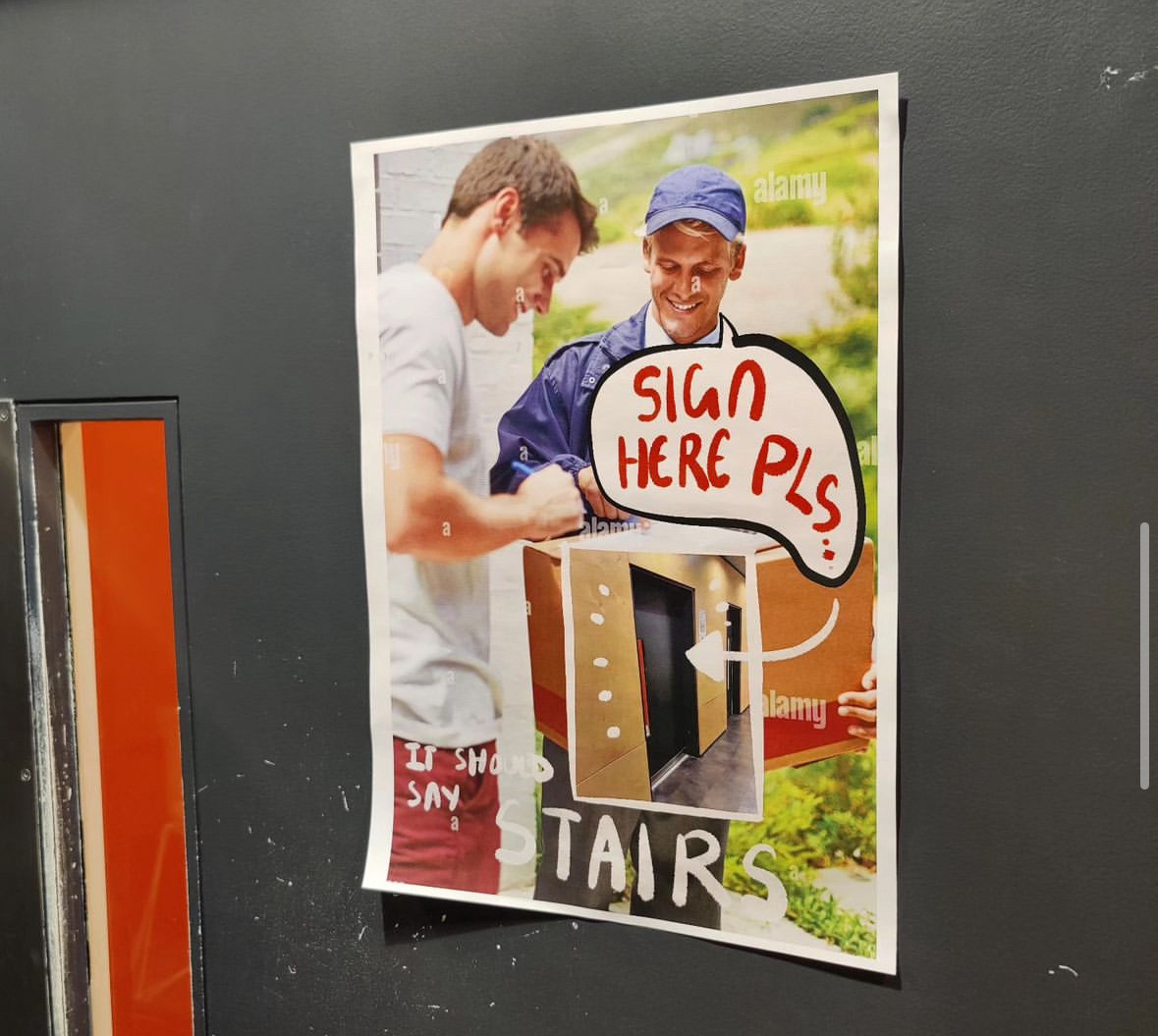 should just put a sign up on the door to the stairs and save everyone the inconvenience. I thought that was a wonderful idea and so I put one up, scribbled it on a piece of paper. It was taken down when I walked by the next morning and when I asked a passing member of the estates team, I was told that we couldn’t have any signage, artwork or promotional material on fire exits.