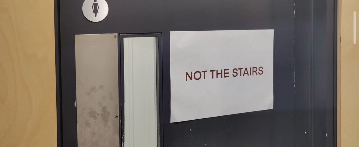 Let me explain: The exit to the stairs and the entrance to the bathroom are right next to each other and the doors are identical. There is a sign hanging from the ceiling but when you’re in a hurry it is easy to miss. I’d heard you say in passing that someone
